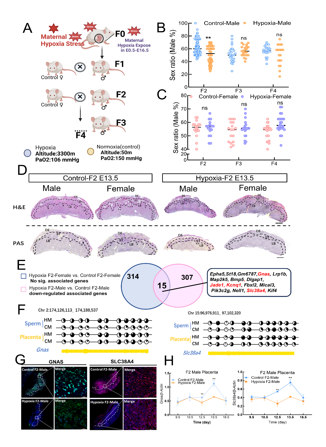 為探究母體低氧環(huán)境暴露對(duì)子代的跨代影響,中國(guó)科學(xué)院西北高原生物研究所動(dòng)物生態(tài)與資源保護(hù)研究團(tuán)隊(duì)建立了孕期低氧暴露小鼠模型,將經(jīng)歷過(guò)孕期低氧暴露的小鼠(F0)轉(zhuǎn)運(yùn)至低海拔后,出生的雄性小鼠和對(duì)照雌鼠合籠,連續(xù)飼養(yǎng)四代(F1-F4)。從2018年 9月到 2023年 8月,通過(guò)大量出生性別統(tǒng)計(jì)和不同發(fā)育階段的性別鑒定,發(fā)現(xiàn)母體孕期低氧暴露會(huì)造成F2代雄性個(gè)體顯著減少。進(jìn)一步的分析發(fā)現(xiàn)F2雄性減少是由于在胚胎期13.5天發(fā)生的胚胎特異性丟失。雄性胚胎丟失的主要原因?yàn)樘ケP(pán)形態(tài)和功能異常。研究團(tuán)隊(duì)通過(guò)胎盤(pán)轉(zhuǎn)錄組和全基因組DNA甲基化測(cè)序聯(lián)合分析,發(fā)現(xiàn)父源印記基因Slc38a4,Gnas,Jade1 和Kcnq1表達(dá)異常。隨后,通過(guò)對(duì)F1代小鼠成熟精子與F2代雄性胎盤(pán)全基因組DNA甲基化進(jìn)行聯(lián)合分析,結(jié)果發(fā)現(xiàn)以上印記基因DNA甲基化模式高度相似。這說(shuō)明經(jīng)歷胚胎期低氧的F1代雄性小鼠的精子存在甲基化異常,并且可以進(jìn)一步影響F2雄性個(gè)體生長(zhǎng)發(fā)育進(jìn)而導(dǎo)致性別比例異常。該工作系統(tǒng)地揭示母體低氧暴露對(duì)F1及F2代發(fā)育影響的跨代遺傳機(jī)制,為深入理解高原低氧暴露的生殖和健康風(fēng)險(xiǎn)提供了新的表型數(shù)據(jù)。